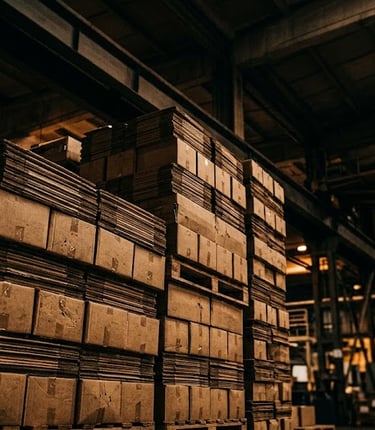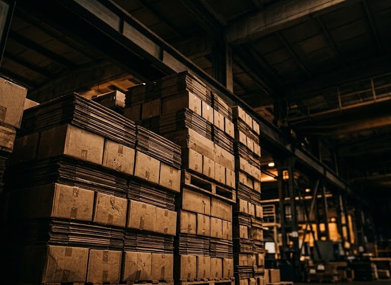 Industrial warehouse with stacks of corrugated boxes ready for shipment.